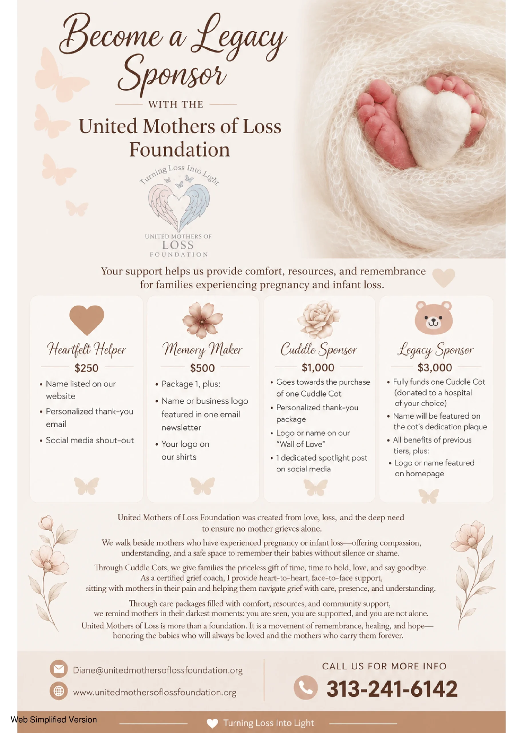 Welcome to the United Mothers of Loss Foundation, a 501(c)(3) nonprofit created to support grieving mothers and families who have experienced miscarriage, stillbirth, infant loss, recurrent loss, or the loss of multiples. Our heart is to ensure that no mother ever has to walk this journey alone.